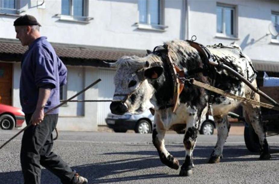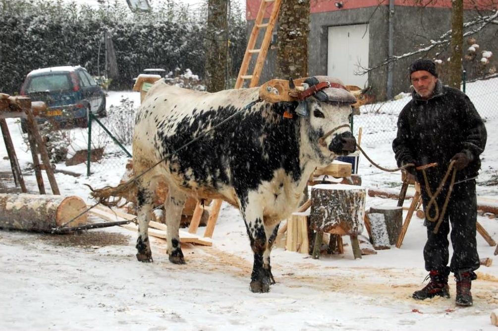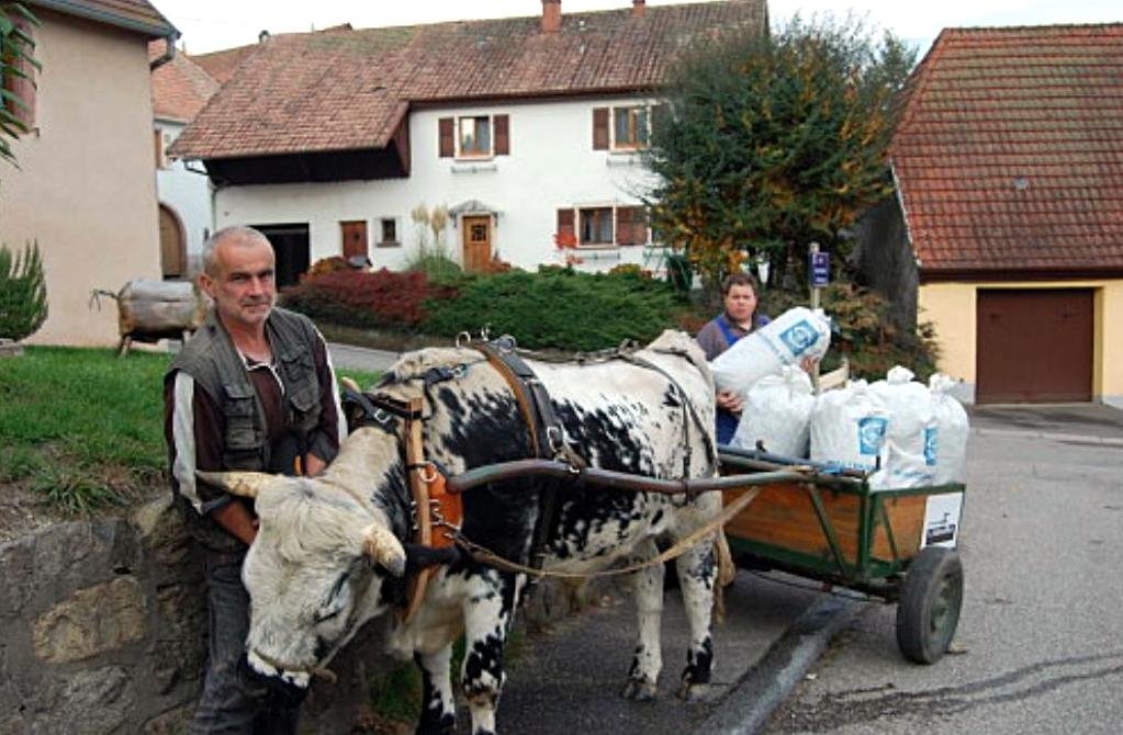 Il travail avec « Givré » son boeuf Vosgien pour ses petits travaux, débusque et charrie du bois, fait du transport pour la micro brasserie associative de Breitenbach.