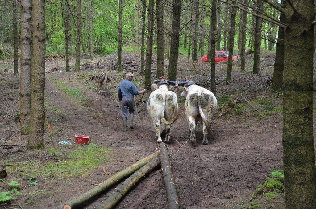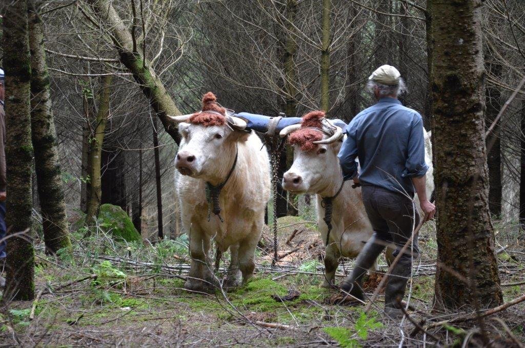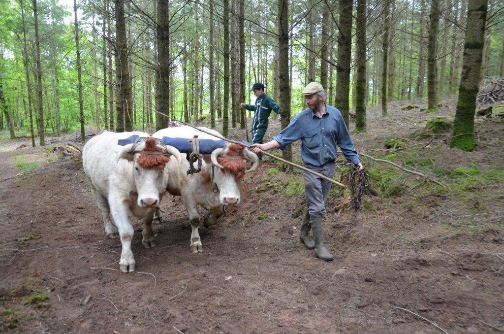 Il vient de débarder avec son boeuf Froment et sa vache Azalée, des éclaircies de sapins Douglas destinées à être sciées pour faire des barricades destinées à des reprises de clôture.