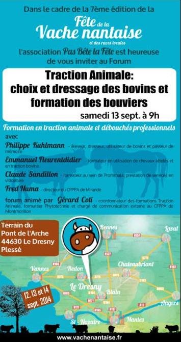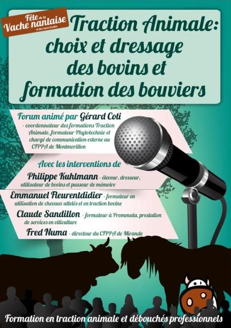 Voici les affiches et le programme du forum consacré au dressage des bovins et à la formation des bouviers, qui aura lieu le samedi 13 Septembre à 9 heure sur le site de la fête de la vache Nantaise.