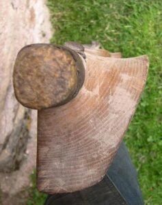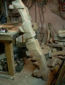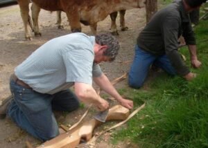 Puis, comme pour un joug massif, intervient la taille de dégrossi réalisée mécaniquement (scie à ruban, tronçonneuse), puis la taille de finition réalisée à la hache, herminette, plane, ciseaux, gouges et râpes.