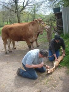 Une fois terminé, le joug a été ajusté sur les deux gros bœufs Aubracs de Marcel Margerit à la Roche-sur-Foron (74). Cliquez ici pour voir.