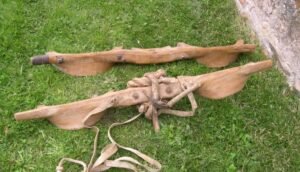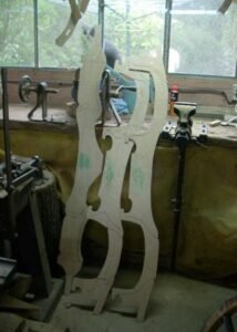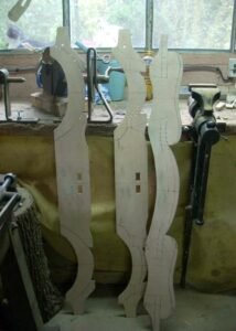 Par sécurité, au niveau des parties les plus fragile aux fortes découpes comme le bas des passages de liens ou le haut des logements des cornes, des chevilles collées en force sont positionnées afin d’éviter, sur un choc, la rupture sur le fil du bois.