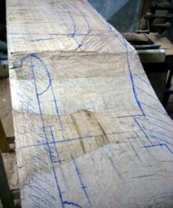 On peut se permettre aussi d’utiliser des planches ou des plateaux qui ne sont pas nécessairement parfaits. Le fait de les coller, de contrarier les fils du bois et les forces entre chaque pièce, donne un résultat final d’une pièce de bois stable et de bonne tenue.