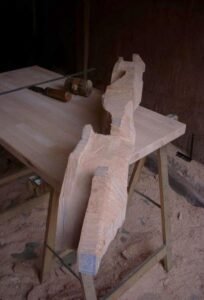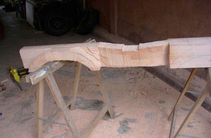Puis, comme pour un joug massif, intervient la taille de dégrossi réalisée mécaniquement (scie à ruban, tronçonneuse), puis la taille de finition réalisée à la hache, herminette, plane, ciseaux, gouges et râpes.