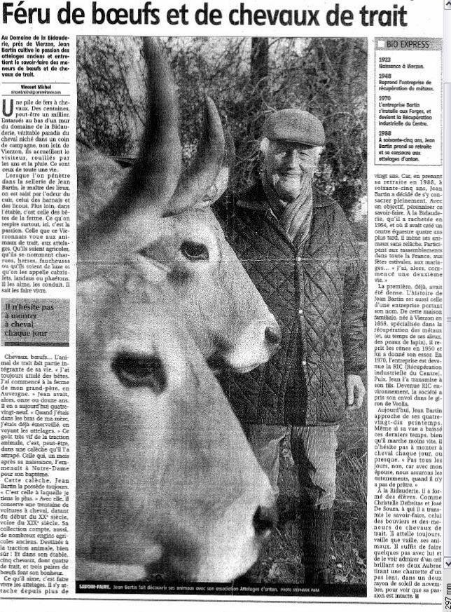 Jean Bartin de Vierzon dans le Cher, passionné et figure incontournable de l’attelage des boeufs, recherche un jeune boeuf déjà dressé ou bien débourré pour compléter une paire dont l’un s’est blessé.
