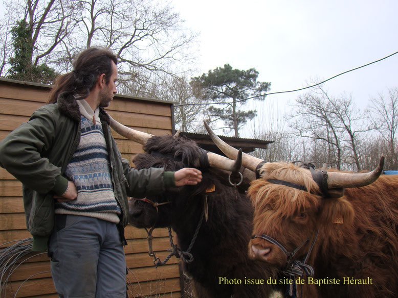 Actuellement, il a une paire de bœufs Highlands (Targos, le noir et Marzin, le roux) achetés à 8 mois dans un élevage à viande dans le Gers. Ils ont été castrés à 18 mois et ont maintenant 6 ans.