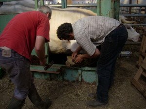 Devant les nombreux déplacements sur sol dur et caillouteux de notre plus jeune paire de vaches, nous avons dû ferrer pour la première fois.