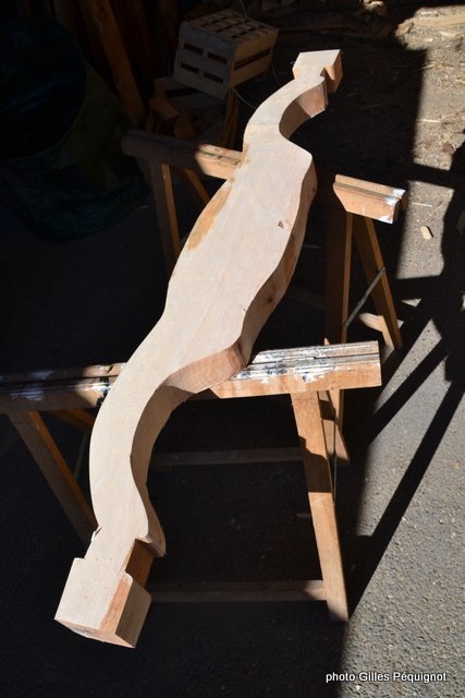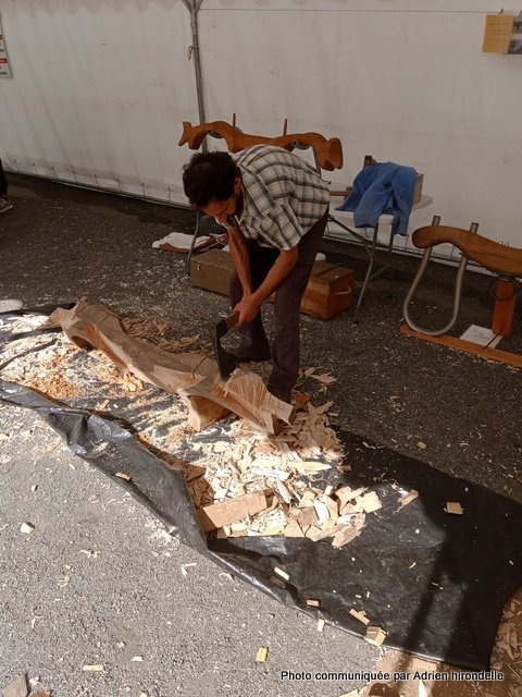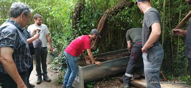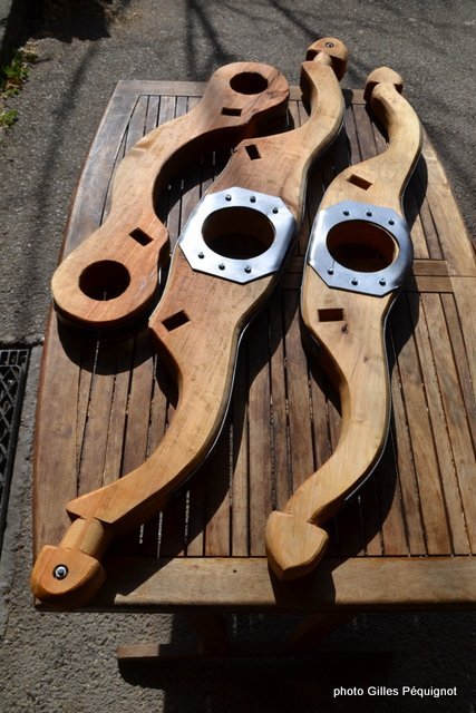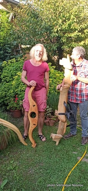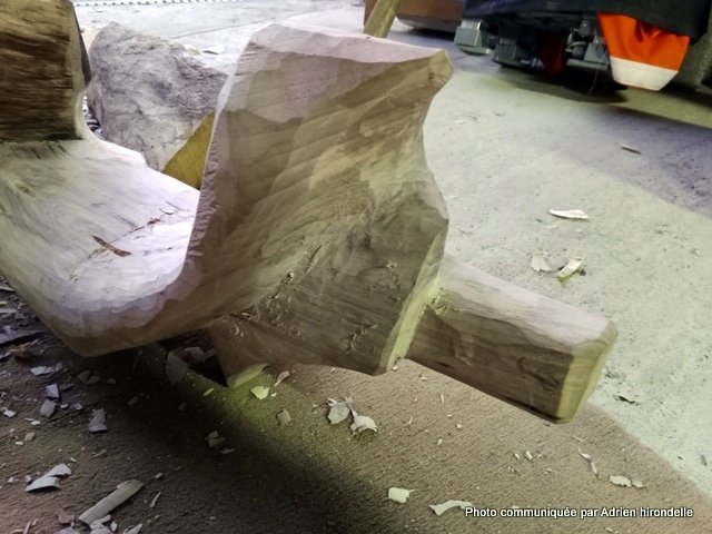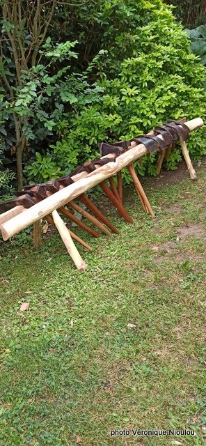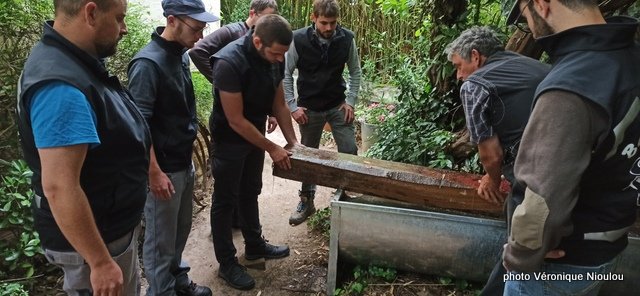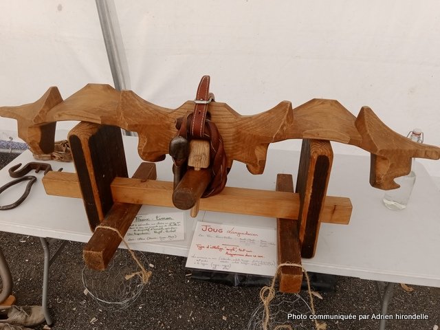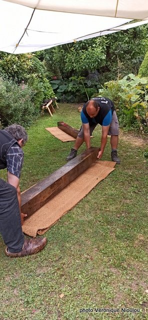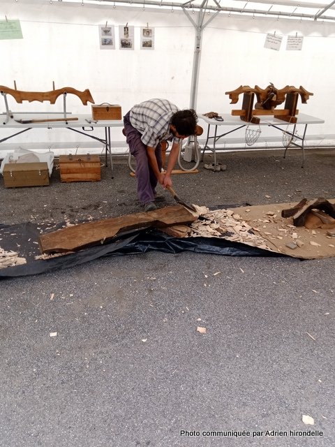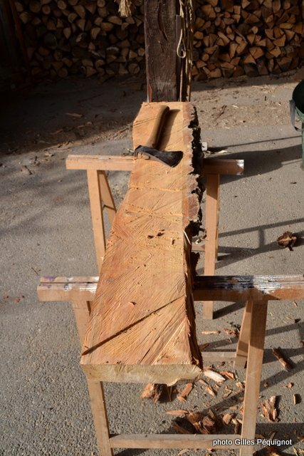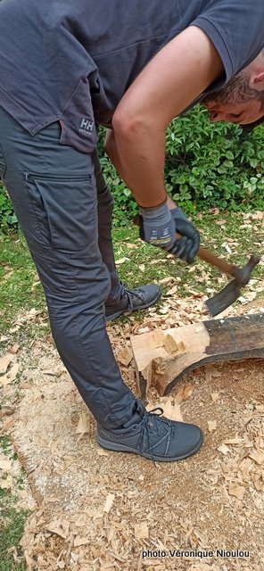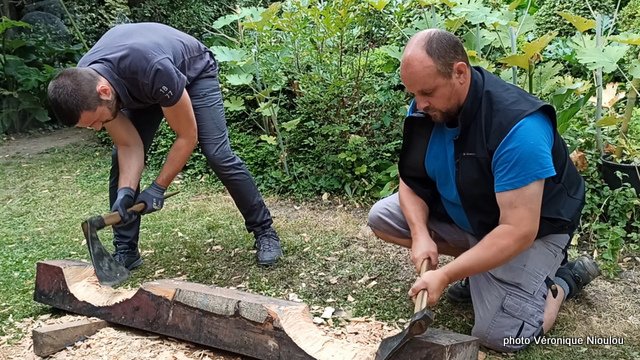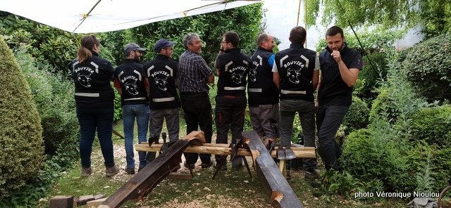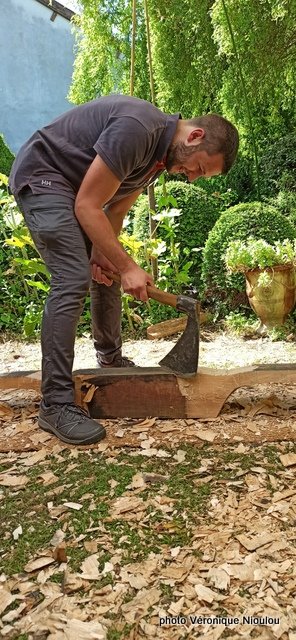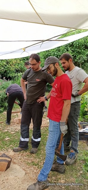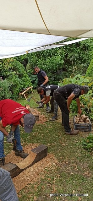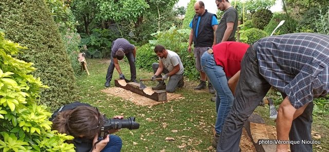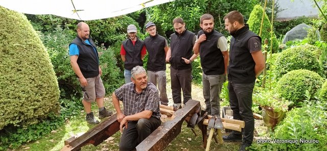 Journée chez Michel Nioulou pour la fabrication des jougs. Rendez-vous à 7h30, rue des charmilles. Le groupe est motivé et en forme pour “tailler des jougs”. Michel nous explique la procédure de la journée, nous présente les différents outils avec leur utilité. On compose deux équipes pour avancer plus vite et pour que tout le monde participe. Nous sortons les morceaux de tilleul des bassins qui immergeait dans l’eau depuis 3 ans. Nous nous installons sur l’herbe et nous commençons par tracer les jougs avec les gabarits « vendéen charolais », les mesures sont adaptées aux bœufs du Puy du Fou. Nous dessinons les 4 faces et nous prenons les haches pour dégrossir le bois. Sous l’œil expert de Michel, les coups et les postures ne sont pas adéquats. Il nous conseille pour être plus efficace et usé moins d’énergie. Petit à petit nous sommes meilleurs et les jougs avancent bien, on aperçoit la forme des futurs jougs. Toujours dans la joie et la bonne humeur, ça chambre, ça déconne mais le travail avance vite et bien. On impressionne Michel et Véronique par notre sérieux et notre engagement. Les copeaux de bois volent de partout, les coups de haches passent près des genoux pour les moins habiles comme Julien, les mains de Hugo commencent à cramper, les gouttes de sueur dégoulinent le long de nos sourires. Les jougs bien avancés, place au traditionnel petit déjeuner des bouviers, où les pains aux chocolats et les sandwichs de rillettes requinquent ces hommes. Rien ne vaut un petit mâconnais pour accompagner ses bouchées. Les bois bien dégrossis, place à la taille des embannures avec les herminettes pour être plus précis. A genoux sur les jougs, les coups s’enchaînent, les gars se relaient car c’est assez physique comme activité. La matinée se déroule tranquillement et le travail avance bien, nous ne les aurons pas finis le soir mais on en fait le plus possible. Personne ne veut s’arrêter en si bon chemin. Viens l’heure de la pause du midi, nous rentrons dans la maison, sur la table une surprise nous attend. Michel et Véronique nous on offert un frêne chacun à planter (bois de l’aiguillon) pour perpétuer cette tradition et deux petites vaches en cuirs par personne. Après l’apéro, Véronique nous à cuisiné une spécialité locale, le saucisson cuit avec ses pommes de terre. Plat conséquent préparé lors des vendanges pour donner à manger aux paysans. Nos ventres bien remplis, nous reprenons le travail avec comme objectif de finir les embannures et tailler les têtières. Nous reprenons les outils et nous recommençons toujours sous les conseils pertinents de Michel. On voit bien la forme des jougs à présent, on se le représente bien sur la tête des bœufs avec le passages des courroies. Après quelques coups d’herminettes et de plane pour arrondir les angles, vient l’heure de s’arrêter mais difficile tellement c’est passionnant, le fait de pas pouvoir finir déçoit mais on les finira cet hiver pendant les académies. Les jougs enroulés dans une bâche et chargés dans la voiture, il est temps de repartir direction l’Alsace. Les salutations achèvent cette formidable et enrichissante journée auprès de Michel et Véronique NIOULOU. Ces deux personnes sont exceptionnelles, chaleureuses, pédagogues, généreuses et ont la joie de vivre. « A la revoyure » « à ctes cotsse », en Vendée où à Mâcon. Merci à vous et à bientôt.