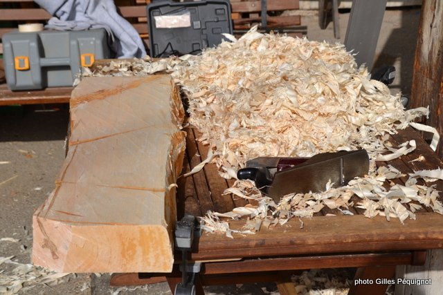Nous sommes arrivés en début de soirée, où nous sommes accueillis à bras ouverts par Michel et sa femme Véronique. Ils nous font visiter leur petit éden de verdure au cœur de la ville. On entre dans un jardin très boisé, verdoyant, calme, frais et très fleuri. C’est là où Michel conserve et taille ses jougs. Nous poursuivons la visite avec l’atelier. Jougs, gabarits, charrette, herminettes, planes, haches… occupent cet espace dans lequel l’odeur du bois est enivrante. Pendant les explications de Michel, certains sont attirés par la “sciure” qui jonche les établis et le sol. Remis de nos émotions, nous nous rejoignons autour d’un moment de convivialité, sucre pour Corentin et Mâconnais pour les autres. Les anecdotes sur les hérissons notamment et les fous rires fusent, la bonne humeur et la convivialité sont bien présentes. Michel nous explique la journée du vendredi qui sera consacrée à la fabrication de deux jougs qu’on ramènera au Puy du Fou. Un livret explicatif nous à été transmis quelques semaines plus tôt pour apprendre la taille d’un joug. Après ces échanges, il est temps de quitter Michel et Véronique pour les retrouver le lendemain. Nous décidons d’aller manger dans un restaurant à Mâcon. Hasard puyfolais, nous sommes accueillis par Marie-Ange. Fous rires et délires accompagnent notre repas. Deux, trois tables débarrassées, nous décidons de continuer cette si belle soirée. Des vendéens qui ne se déplacent jamais sans leur planche à palet décident de faire une partie sur le parking de 4 murs. Après de longues heures, la fatigue se fait ressentir et nos bouviers regagnent l’hôtel car demain la journée s’annonce physique et longue.