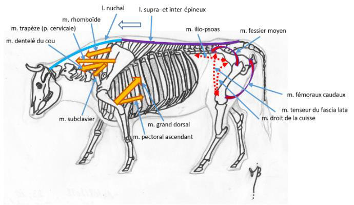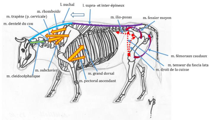 En commençant par la chaine droite, L4 (FRSG) a été considéré comme la dysfonction primordiale, du fait de sa position assez centrale sur la chaine dysfonctionnelle sur le squelette axial et son lien avec la deuxième chaine, qui sera explicité ultérieurement. Les tensions pouvaient se redistribuer à l’ilium (droit ventral) via l’aponévrose du muscle grand dorsal et le muscle fessier moyen, puis se poursuivre via le fascia coccygien à Cd1 (FRSD). En repartant par l’avant, et toujours via le muscle grand dorsal, la L4 pouvait être en relation avec T12 (FRSG) et T7 (FRSG). Ensuite, successivement via le chef thoracique puis cervical du muscle trapèze, les tensions pouvaient remonter jusqu’à l’occiput (droit dorsal). Le muscle longissimus permettrait de transmettre les tensions de L7 à C4 (ERSD). Les frontaux (en expir) semblaient être indépendants du reste de la chaine, les deux étant touchés de façon similaire. Les cornes y étaient sans doute pour beaucoup. La pousse anormale des cornes quant à elle était peut-être due à la génétique.