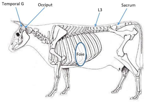 Il était tout de même intéressant de noter que concernant la paire de boeufs béarnais, la différence de gabarit avait pour conséquence un défaut de positionnement de la tête pour les deux animaux et ces derniers partageaient un certain nombre de dysfonctions, un schéma global similaire, plus marqué pour le plus petit des deux. Chez Chouan, c’est la L3 et non L2 qui est ressortie de l’examen ostéopathique. Les sensibilités propres à chacun font ressortir les dysfonctions à des zones d’éventuelles fragilités antérieures à la fixation. A la différence de Martin (béarnais), Chouan présentait une dysfonction sur le foie.