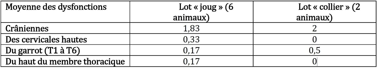 La présente étude n’a pas permis de faire une distinction du point de vue ostéopathique entre le travail de traction de bovins au joug ou au collier d’épaule.