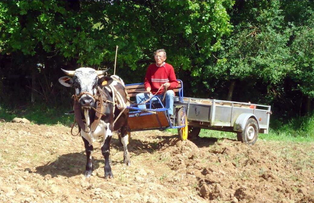 Jo Durand travaille sur sa ferme avec entre autres, une paire de boeufs Vosgiens. Il a aussi dressé un boeuf Vosgien en solo qu’il mène souvent en guide.