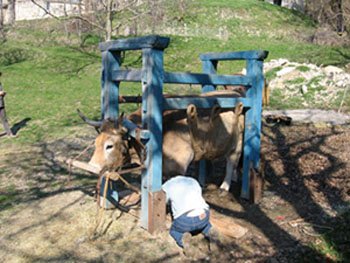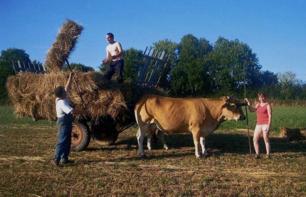 Après avoir démissionné de l’ONF, j’ai repris une ferme laitière en vente directe en montagne vosgienne à 21 ans ! Travaillant avec un tracteur au début (1981), j’ai dressé mon taureau de reproduction pour de menus travaux, puis je l’ai utilisé de plus en plus, puis dressé d’autres, puis des paires de bœufs…