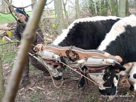 Le bouvier alsacien Philippe Kuhlmann en train de débarder avec des bœufs de race Vosgienne de Lauresham, attelées au joug à coussins intégrés qu’il a lui-même inventé (Photo Astrid Masson)