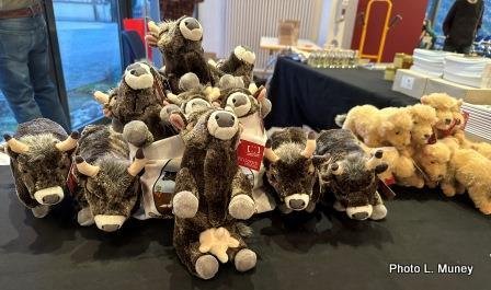La table de présentation des peluches, « best-sellers » de la boutique de Lauresham, modélisées sur la paire originale de Gris de Lauresham, Darius et David (Photo L. Muney)