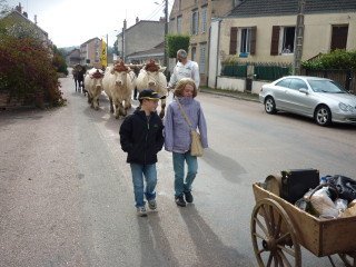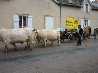 Nous avons, en collaboration avec nos amis des « Gas du Tsarollais », le groupe folklorique de Charolles, défilé dans la ville de Charolles avec un char chargé de grumes attelé aux deux paires de vaches, en nous rendant sur le site de la rencontre, au lycée agricole.