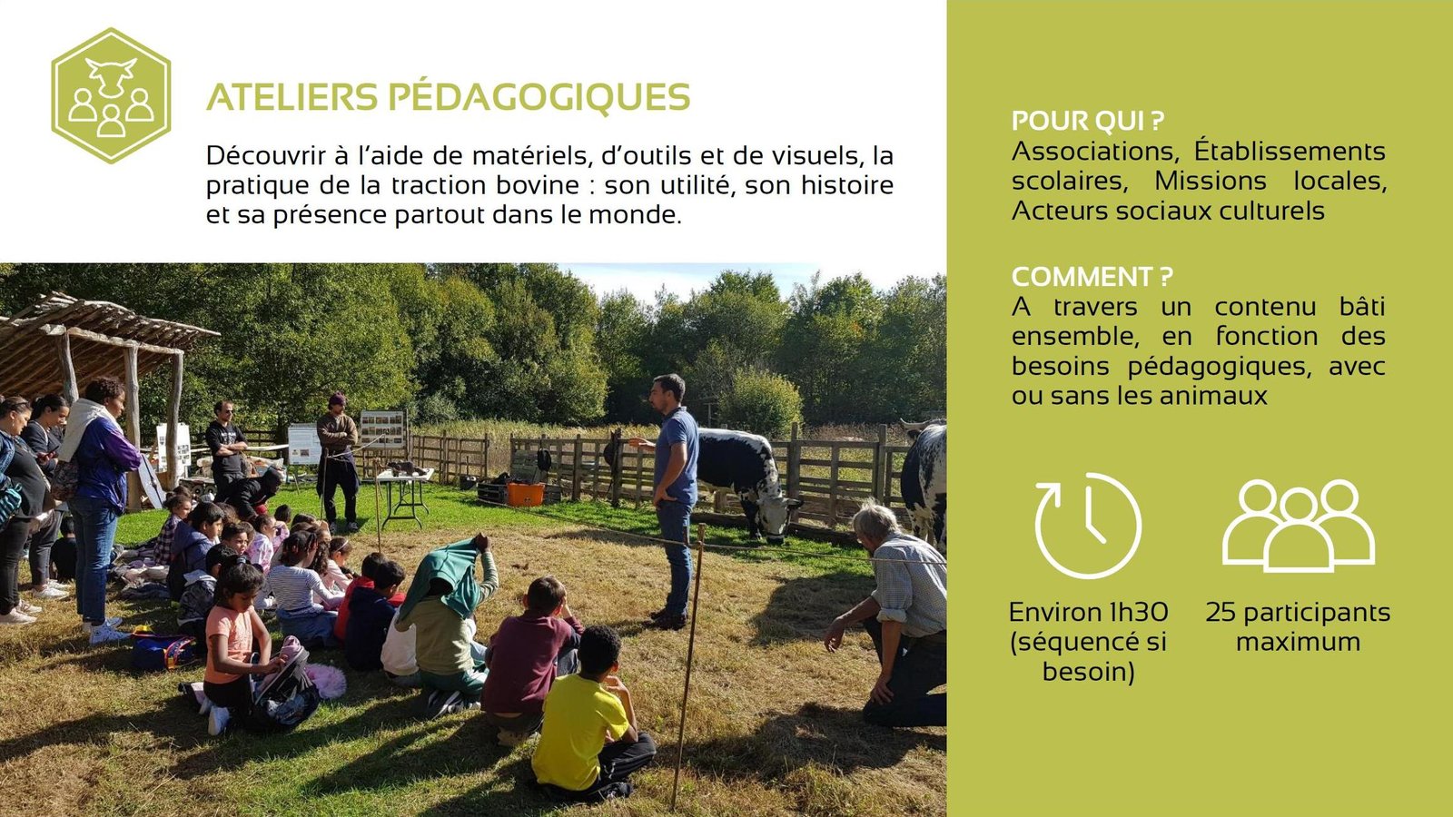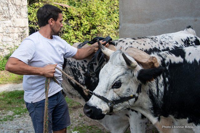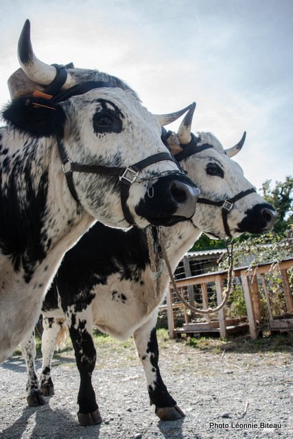 La spécialité d’Anne est l’observation du comportement et la manipulation respectueuse des bovins de trait et elle a déjà dressé de nombreux animaux. Ce week-end, elle nous a montré comment initier de manière ludique des veaux à leurs futures tâches. Pour l’entraînement, elle utilise consciemment les besoins et les élans naturels des animaux, comme le besoin de jouer après avoir bu du lait maternel : tout éleveur de bovins connaît le « sautillement » des très jeunes veaux, juste après avoir bu au pis de leur mère ou du seau contenant son lait. Anne utilise cette explosion d’énergie naturelle pour courir avec les veaux, sauter par-dessus des obstacles ou monter des escaliers.