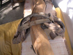 Le raccord entre le cuir et la corde est simple. Le cuir est entaillé d’une fente de trois centimètres arrêtée à l’emporte pièce de chaque côté. La corde est bouclée à un bout. Le cuir est passé à travers la boucle et le brin de la corde passé à l’intérieur de la fente.
