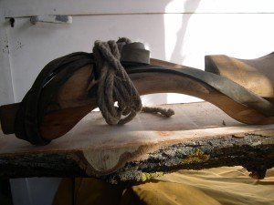Attelles . Les attelles sont formées à partir de deux morceaux de bois, en forme pour épouser les contours de l’animal (voir Figure 9). Ils doivent être fabriqués à partir du disque, mais le bois élastique, par exemple, le bois utilisé localement pour la fabrication de manches d’outils agricoles tels que des haches ou des houes. Il est important de veiller à ce que le grain du bois longe la courbe, car cela renforce les attelles. Si le grain ne suit pas la courbe, ou s’étendant dans la direction opposée, les attelles peuvent se briser – en particulier au niveau des points où les traces sont attachés ou lorsque la courbe est la plus accentuée.
