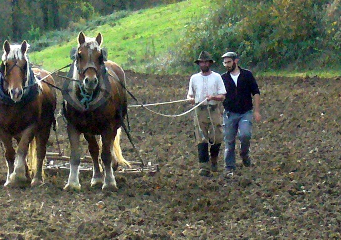 Un ou deux bœufs peuvent être utilisés, ici, on travaille avec Varo et Grivé, la paire de boeufs Vosgiens de Manu Fleurentdidier ( formateur traction animale, CFPPA de Montmorillon).