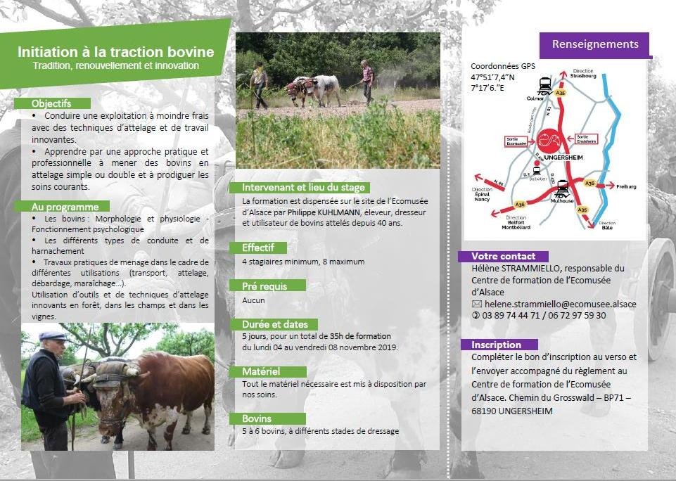 - 10h-12h : accueil des participants et causerie sur le thème Travailler réellement avec des bœufs au XXIème siècle, en interface des visiteurs (place des charpentiers) et en présence de Denis Leroy, directeur de l’Ecomusée d’Alsace, et avec quelques exemplaires du Manuel complet sur l’attelage des bovins de Philippe Kuhlmann.