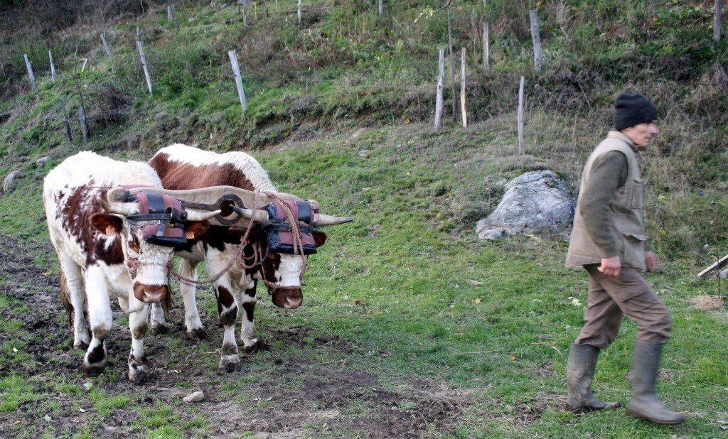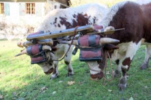 Parallèlement, j’ai remonté un troupeau de bovins et actuellement ce sont 3 à 5 paires de bœufs, taureaux et vaches qui réalisent les travaux de la ferme, 35 ha de prairies dont 28 fauchées. Une estive de 20 ha permet d’élever les jeunes bêtes, génisses et bouvillons.