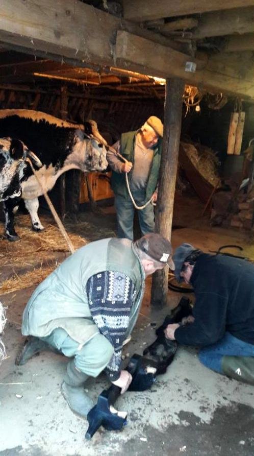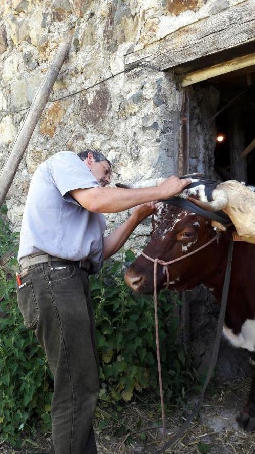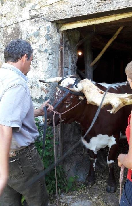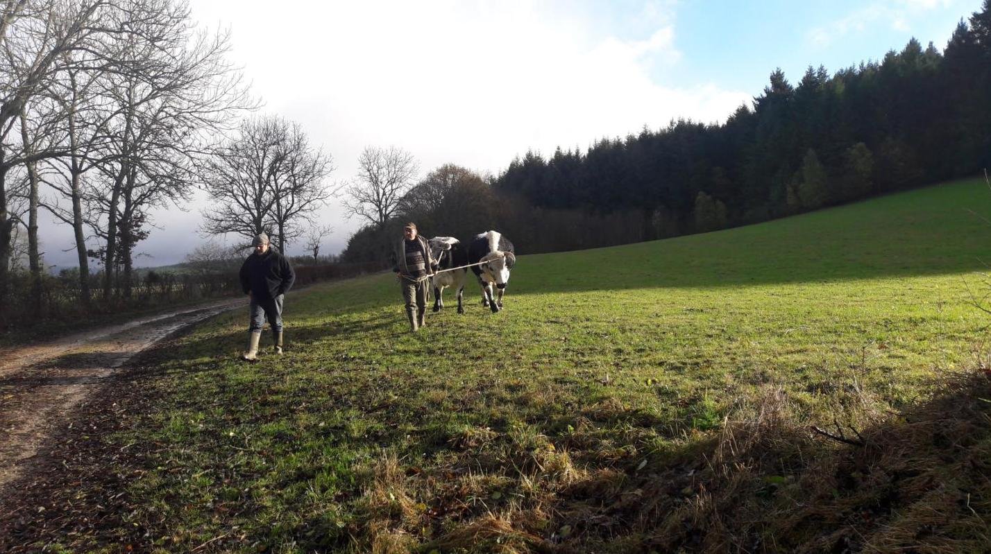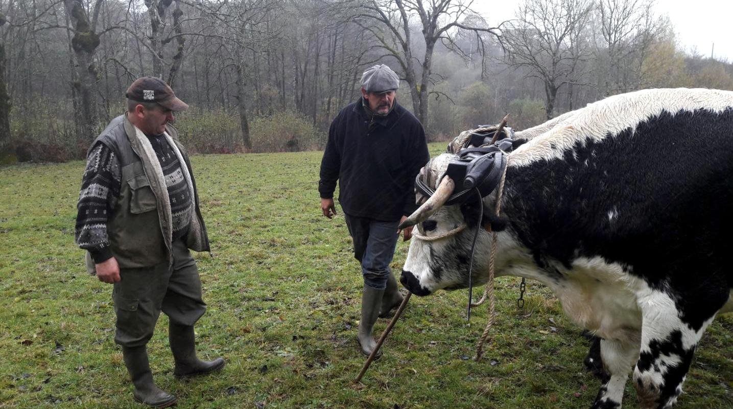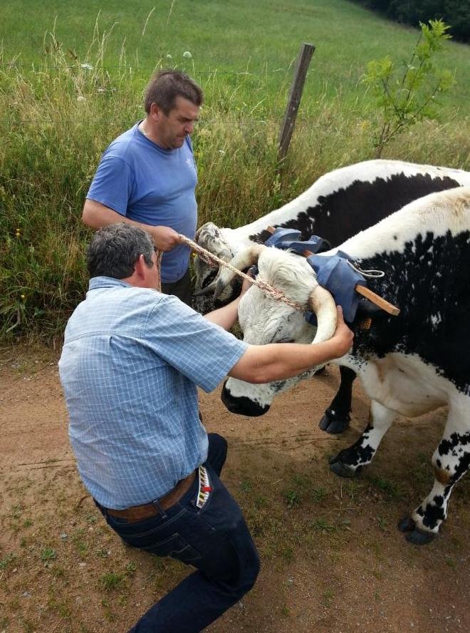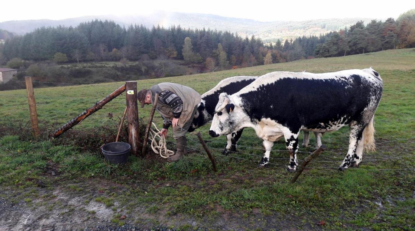 Jo Durand, le régional de l’équipe, avec ses animaux Vosgiens, un boeuf solo et deux génisses en guides.