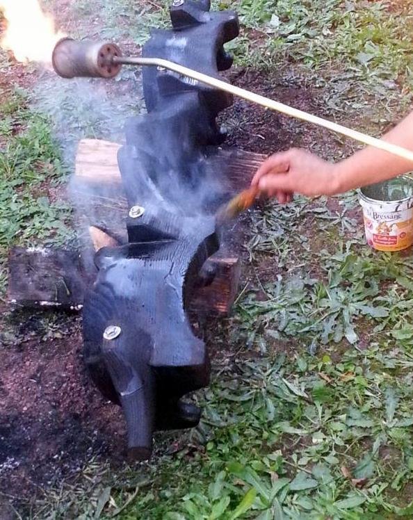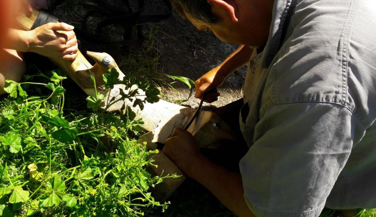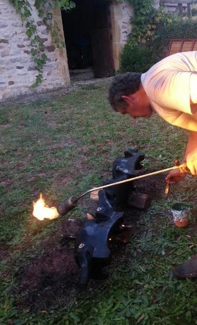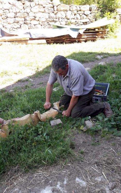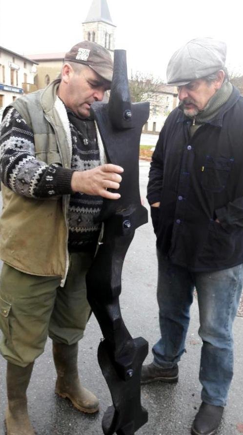 Durant la fête, Lionel Rouanet a taillé un joug du type « Aveyronnais» à partir d’une grume de frêne livrée sur le site dès jeudi soir. Les trois jours de manifestations ont permis d’amener la taille presque à son terme. Les questionnements du public et les explications nombreuses apportées par Lionel ont bien sûr ralenti le travail. Mais le fait que le joug n’ait pas pu être terminé complètement sur trois jours, est la preuve de l’intérêt qu’a pu susciter la présence d’un des derniers (et jeune) jougtiers de France, dont l’apprentissage s’est déroulé auprès de René Alibert, fabricant de jougs réputé de l’Aveyron, disparu en Août 2017.