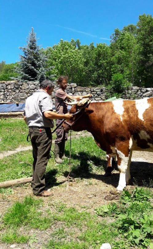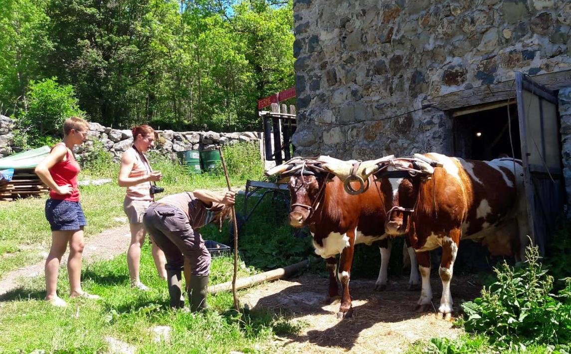 Jo Durand a pris en guide un jeune boeuf Vosgien qu’il a progressivement mis à la traction, en particulier au griffage dans l’espace des vignes. Il avait aussi deux jeunes vaches Vosgiennes utilisées par une équipe de réalisation de torchis en terre. Les deux bêtes menées en guide brassaient la terre humidifiée en la foulant aux pieds au fond d’une tranchée circulaire. Les bêtes ont été menées sans encombre par les membres de l’équipe des maçons, malgré le travail répétitif en rond serré que les animaux ont ordinairement parfois du mal à réaliser sans énervement.
