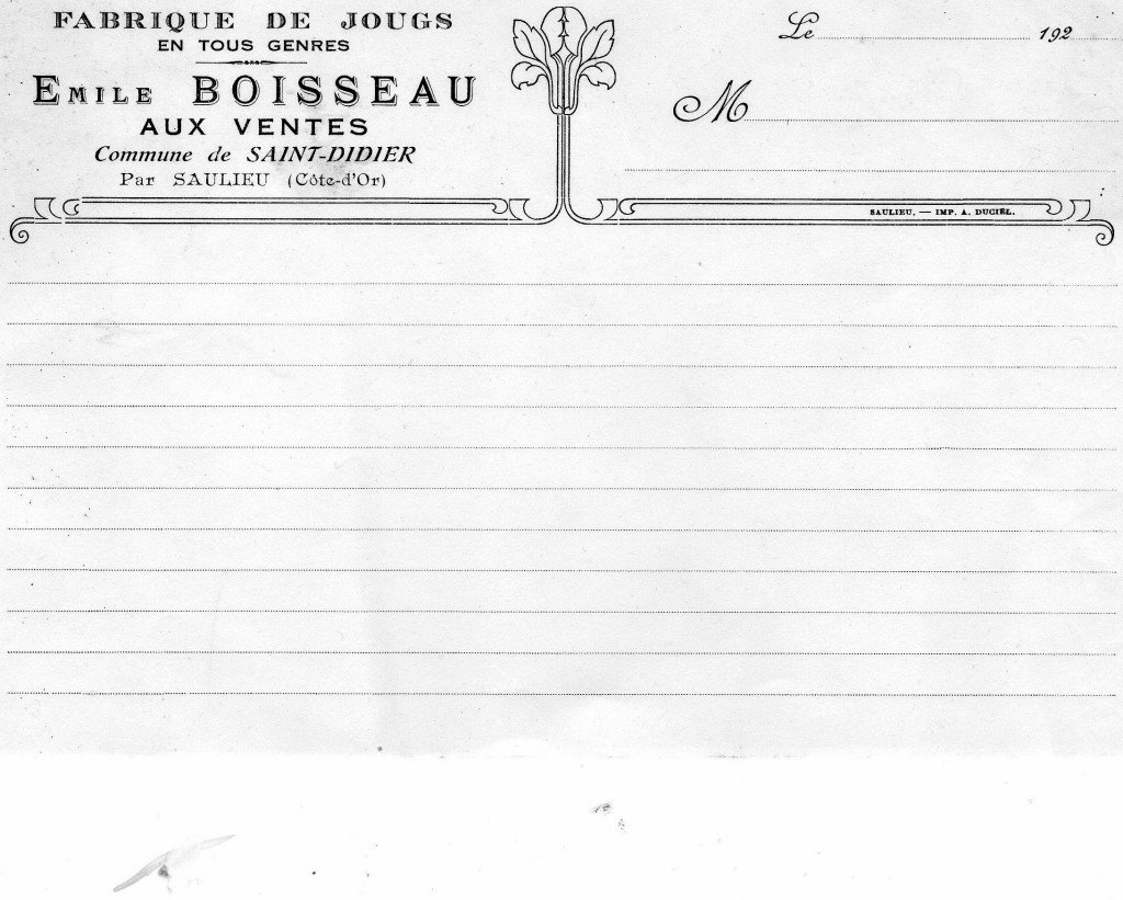 C’est un papier à en-tête d’un fabricant de joug de Côte-d’Or. Ce jougtier travaillait vers 1920-40 aux Ventes, commune de Saint-Didier -21210- près de Saulieu. Il taillait à l’herminette bien sûr, dans son atelier de ce hameau qui comptait vers 1930 une trentaine de personnes. Il fréquentait les foires, notamment celle de Saulieu et faisait des dépôts chez des commerçants de son secteur. Il travaillait le hêtre.