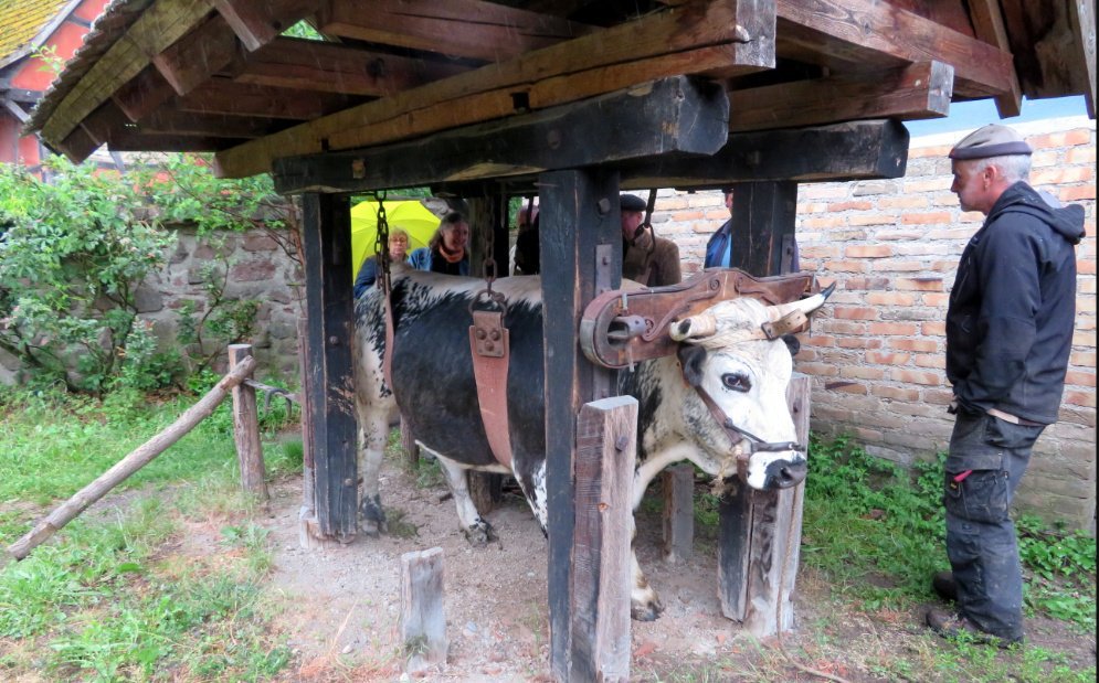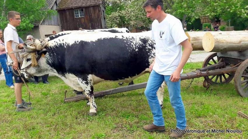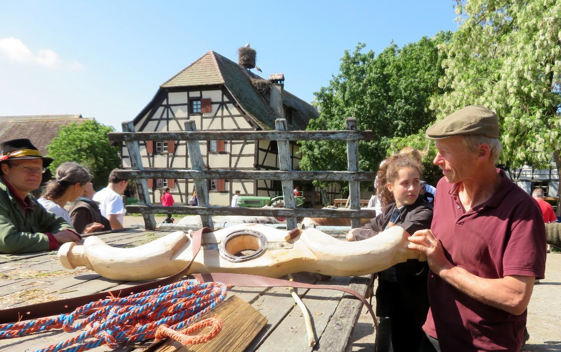 À l’amusement général, Philippe, accompagné au micro par une animatrice de l’équipe agricole, montre comment passer une paire de bœufs attelée autour d’un arbre quand la forêt est trop dense, en les pivotant autour d’un poteau de la maison du Sundgau – un travail de patience, presque une valse au ralenti.