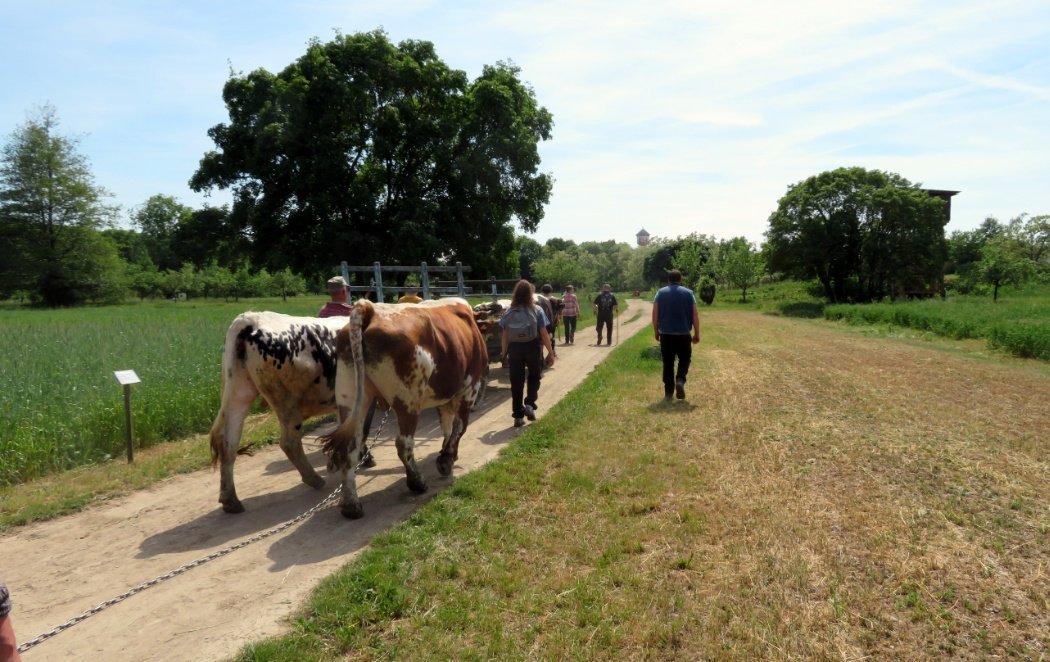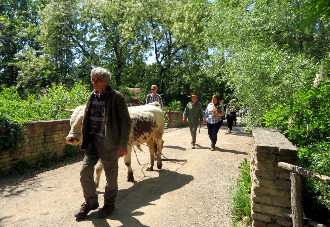 Le côté nature nous attire tous, et les bouviers, arrivés de bonne heure, ne manquent pas de profiter du chemin de la réserve naturelle, d’inspecter le jardin sur paille ou de partager quelques instants la vie d’une butineuse, de découvrir aussi que le clocher englouti a été transporté à l’Écomusée par…. une paire de bœufs ! Visiter la Maison des Coiffes, s’arrêter chez le luthier, ou chez le barbier pour se faire raser à l’ancienne, monter la tour en pierre pour la vue panoramique de l’Ecomusée, prendre le bateau des marais – la journée est plus que remplie pour les visiteurs.