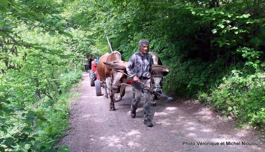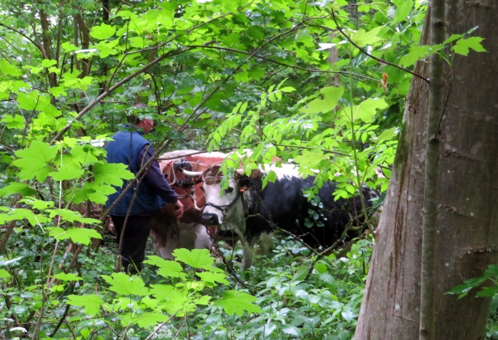 Et voilà que surgit le « souci des orties », pour ainsi dire. Comment marier sans déception l’attente des visiteurs chaussés de petites sandales et le travail de débardage en forêt ? Un coup de tête des bœufs et les billes partent vite, balayant le chemin – un moment où il faut sévir, et Philippe n’hésite pas à le faire, pour assurer la sécurité des touristes inconscients du danger, rangés un peu pêle-mêle au côté des bouviers.