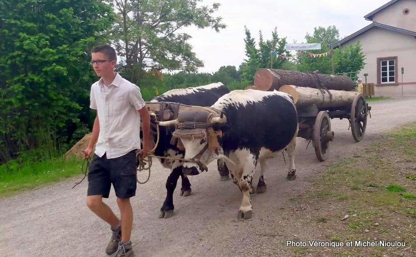 C’est bien plus facile à la Place des Charpentiers, cœur du village, où les animateurs de l’équipe agricole présentent la traction chevaline et passent le micro à Philippe, qui décrit la race vosgienne, puis introduit chaque attelage bovin.