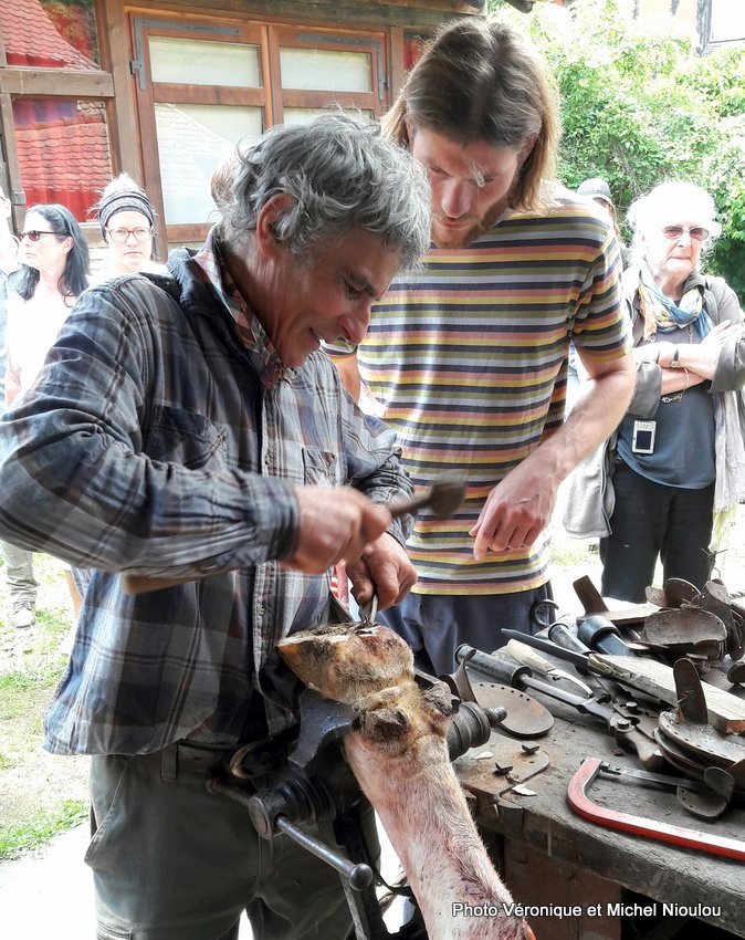 Échanges animés, dessins par terre dans les graviers, les forgerons se lèvent pour rejoindre la forge et nous repartons à la Maison des Goûts et des Couleurs pour écouter le pareur Bernard Barbe (Cliquez ici pour voir), invité de Nicole Bochet, nous faire un bref exposé sur les maladies des pieds et les soins qui s’imposent. Sa description est d’autant plus passionnante, qu’il a l’habitude de soigner des vaches laitières, logées dans des étables souvent semi-industrielles.