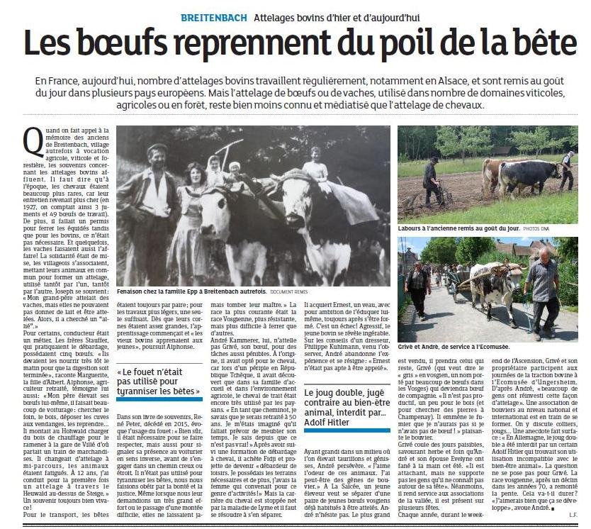 André Kammerer, ancien cheminot et aujourd’hui bouvier, a amené sa nouvelle paire, Tino, le rouge, et Greby le noir. André est allé une fois par semaine chez Philippe à partir de fin mars pour les débourrer et ce sera leur première occasion de « monter sur scène » à l’Ecomusée. Philippe amène ses bœufs, le rouge Manny et le noir Milou, pour rejoindre le contingent régulier de l’EMA pour la présentation des bovins à la grande Place des Charpentiers, centre du village de l’Écomusée, cœur aussi de son histoire et de ce concept d’assemblage d’habitats alsaciens.