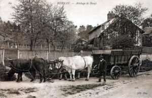 Quatre bœufs portant des jouguets frontaux tirent un chariot betteravier aux environs de Bernay dans l’Eure. Une rapide enquête bibliographique nous faisait rapprocher ce curieux équipage – pour la région – de la sucrerie-distillerie de Nassandres, à une encablure de là. Une autre photographie et les extraits d’une monographie sur l’établissement nous livrent un nouvel éclairage…