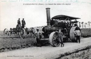 Le battage se fait avec une machine à grand travail de construction anglaise « Clayton-Shuttlevorth » assortie d’un lieur et un compteur de gerbes. La batteuse est entraînée par une locomotive routière également de construction anglaise « Burrell and Sons » qui la remorque de ferme en ferme.