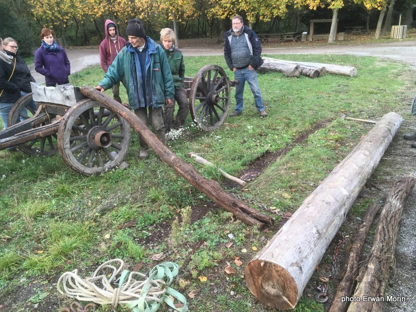 Un soupçon de pluie nous accompagne aux premières heures du dimanche (ou comme le dit un participant, « il pleut mouillé »), mais nous sommes bien à l’abri pour la synthèse finale. Comme tout au long du programme, on fait valoir le principe de souplesse, ne serait-ce que pour s’adapter aux souhaits exprimés par les divers participants. Par exemple, les bouviers vendéens auraient tellement voulu s’essayer à la construction d’une charrette chez Michel Nioulou, mais le temps a manqué. Chez Philippe le dimanche matin, ils tombent sur un châssis de chariot et coupent le bois pour fabriquer presque instantanément une charrette. Effectivement, la veille pendant la nuit, ceux qui dormaient à la ferme ont bien remarqué un bruit un peu mystérieux…