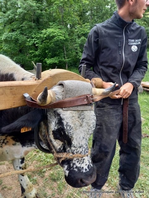 C’est alors que Gilles Péquignot et Danyèle Besserer du groupe de musique traditionnelle « Au gré des vents » arrivent pour leur première intervention durant ces quatre journées. Gilles est un voisin de Philippe et ami depuis longtemps de Michel Nioulou, au point qu’il s’est décidé pendant le confinement de se mettre aussi à la taille des jougs (voir Sabots N°108 mai-juin 2022). Danyèle et Gilles ajoutent chaque jour à l’ambiance festive et amicale de la rencontre – à la ferme à Soultzeren, au village du Valtin le samedi et à Soultzeren le dimanche. La convivialité étant déjà bien en place, nous recommençons nos échanges sur les enjeux de la traction bovine, sur l’avenir des agricultures à petite échelle à travers l’Europe et au-delà, et surtout sur le sujet crucial de la transmission des savoirs et sur la manière de construire une image positive de la traction animale. Comme le bouvier alsacien André Kammerer, qui à sa retraite s’est lancé le défi de ne plus conduire des trains, mais des bœufs, et qui a transmis cette passion à son petit-fils Corentin. Les conversations entre générations fusent et, à la fin, Guy Chautard, l’éleveur de Ferrandaises, passe à Corentin son béret avec le blason de la race en symbole de la transmission.
