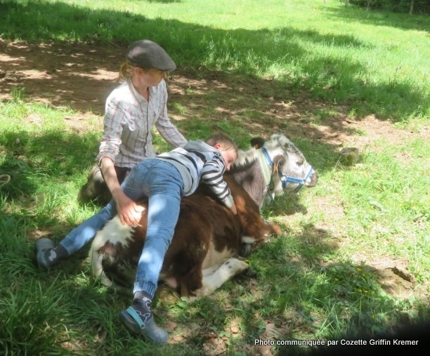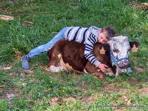 Anne Wiltafsky rapproche l’enfant et le jeune bœuf, Photo Léonnie Biteau