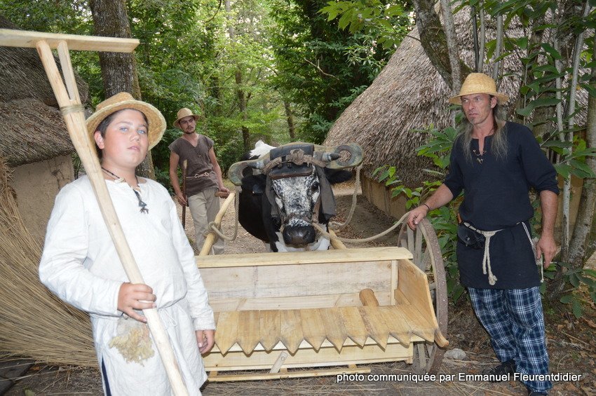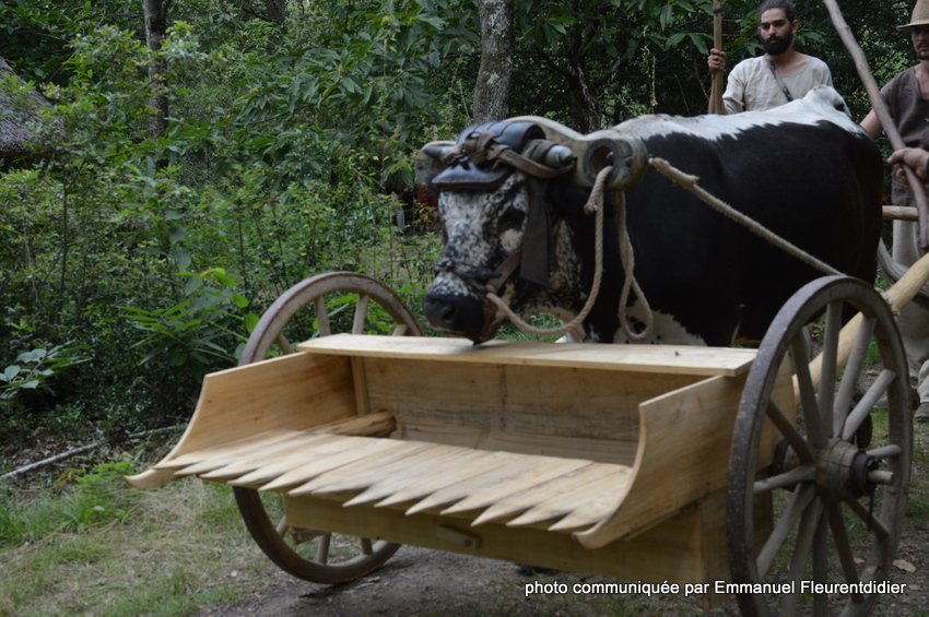 D’autres essais avaient été réalisés avec un cheval ou un âne et même avec des hommes. La réalisation de la moissonneuse n’est pas seulement du folklore « à la gauloise » pour le grand public venu passer la journée sur ce site, mais c’est surtout une restitution grandeur réelle avec deux archéologues, Sammy Benmakhad doctorant archéo-agronome, et Stéphane Gaudefroy, de l’INRAP et céramologue, venus pour l’occasion.