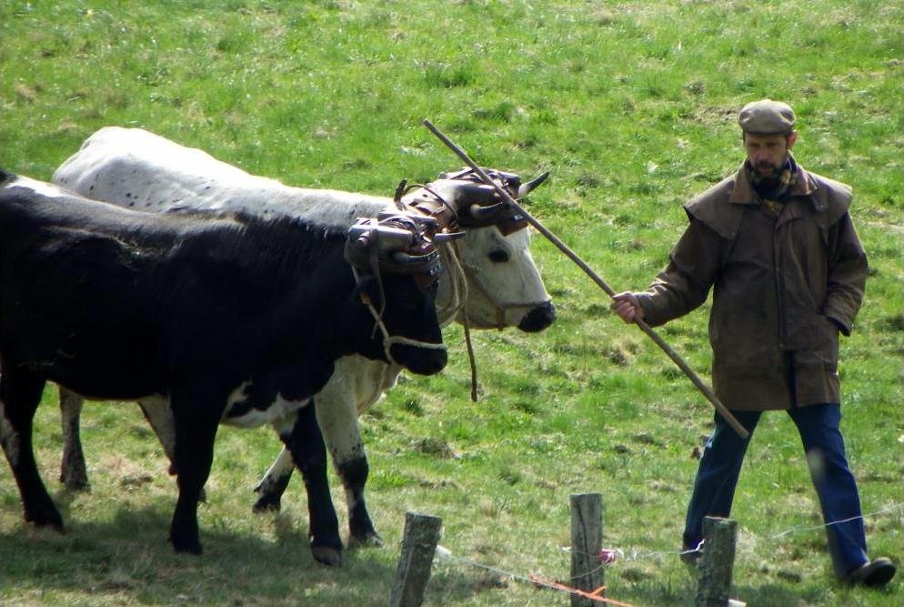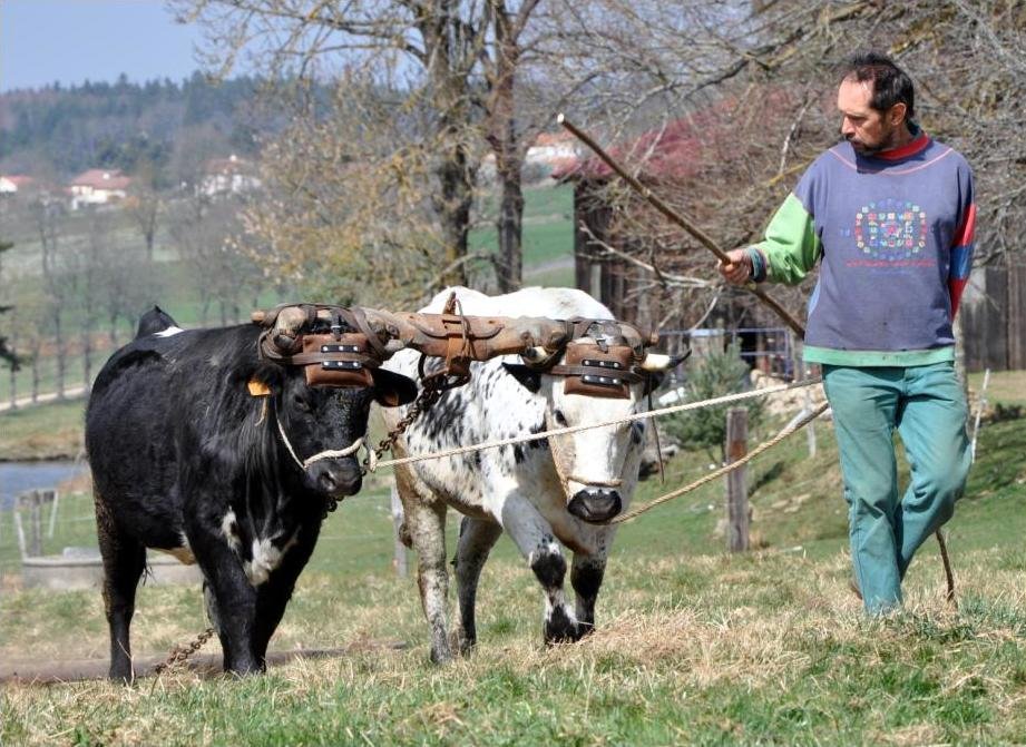 Il a un tracteur, mais travaille encore beaucoup avec ses trois paires de vaches Salers.