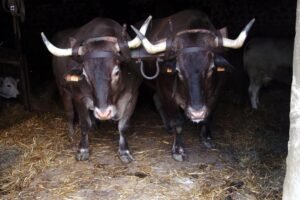 Les vaches sont Brunes d’Origine (Suisses traditionnelles) et les bœufs, gascons.