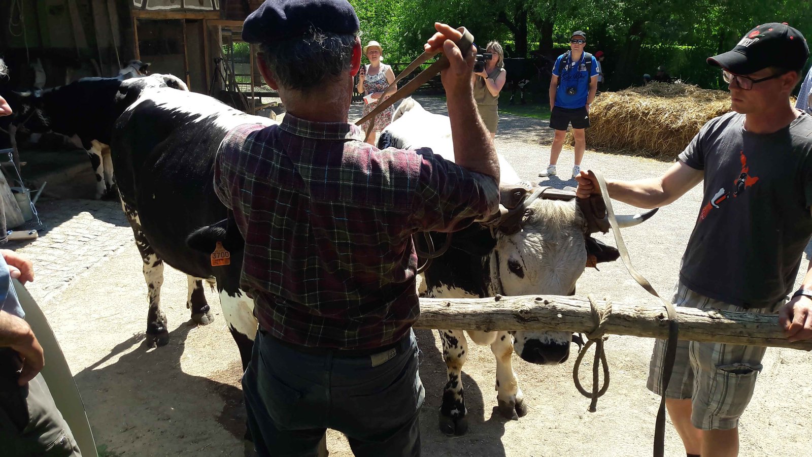 Michel Berne a lié les bœufs de l’écomusée avec son très beau joug du Pilat, permettant ainsi de voir sa méthode de liage et de menage.