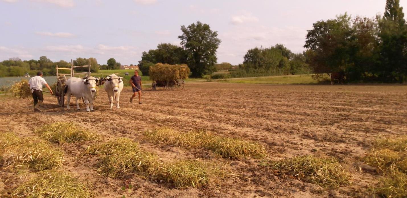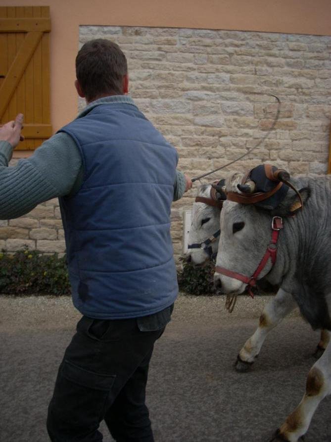 Toujours sur ce sujet de la voix, c’est encore la SEZ qui en 2008 a accueilli une journée d’étude consacrée à « L’homme et l’animal : voix, sons, musique… » (n°84 de la revue). Plusieurs contributions touchaient directement à la question de comment manier les bovins au travail ou racontaient leurs charmes : celle du bouvier Philippe Kuhlmann pour l’Alsace, Inja Smerdel pour la Slovénie, Cozette Griffin-Kremer pour les cultures « celtiques » des Îles Britanniques. Germain Dalin y a évoqué ses propres aventures de « relations » avec les taureaux lors de son travail sur l’insémination artificielle et – pour ne pas être injuste envers les chevaux de trait – Henri Baron nous a époustouflés (le mot n’est pas trop fort) avec son évocation des commandes et surtout la démonstration en plein amphithéâtre de l’Académie de l’Agriculture du claquement de son fouet en micocoulier. Par ailleurs, l’article sur le grincement des chars au Portugal par Mouette Barboff était accompagné d’une photo impressionnante de transport de seigle par des attelages de bœufs, menés par des femmes. Les travaux d’ethnologues recèlent de trésors sur les pratiques et les croyances liées aux bœufs (un seul exemple, Méchin, 2010), spécifiques à tel ou tel terroir, sujet vastissime.