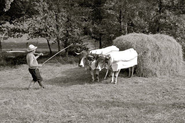 Toujours sur ce sujet de la voix, c’est encore la SEZ qui en 2008 a accueilli une journée d’étude consacrée à « L’homme et l’animal : voix, sons, musique… » (n°84 de la revue). Plusieurs contributions touchaient directement à la question de comment manier les bovins au travail ou racontaient leurs charmes : celle du bouvier Philippe Kuhlmann pour l’Alsace, Inja Smerdel pour la Slovénie, Cozette Griffin-Kremer pour les cultures « celtiques » des Îles Britanniques. Germain Dalin y a évoqué ses propres aventures de « relations » avec les taureaux lors de son travail sur l’insémination artificielle et – pour ne pas être injuste envers les chevaux de trait – Henri Baron nous a époustouflés (le mot n’est pas trop fort) avec son évocation des commandes et surtout la démonstration en plein amphithéâtre de l’Académie de l’Agriculture du claquement de son fouet en micocoulier. Par ailleurs, l’article sur le grincement des chars au Portugal par Mouette Barboff était accompagné d’une photo impressionnante de transport de seigle par des attelages de bœufs, menés par des femmes. Les travaux d’ethnologues recèlent de trésors sur les pratiques et les croyances liées aux bœufs (un seul exemple, Méchin, 2010), spécifiques à tel ou tel terroir, sujet vastissime.