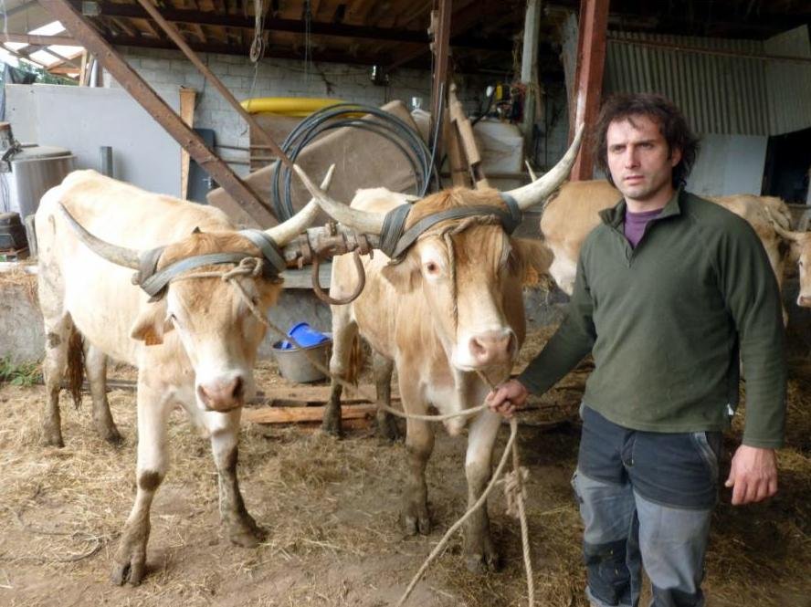 Daniel Hourqueig attelle pour son plaisir deux paires de vaches Blondes d’Aquitaine et une paire de vaches Béarnaises.