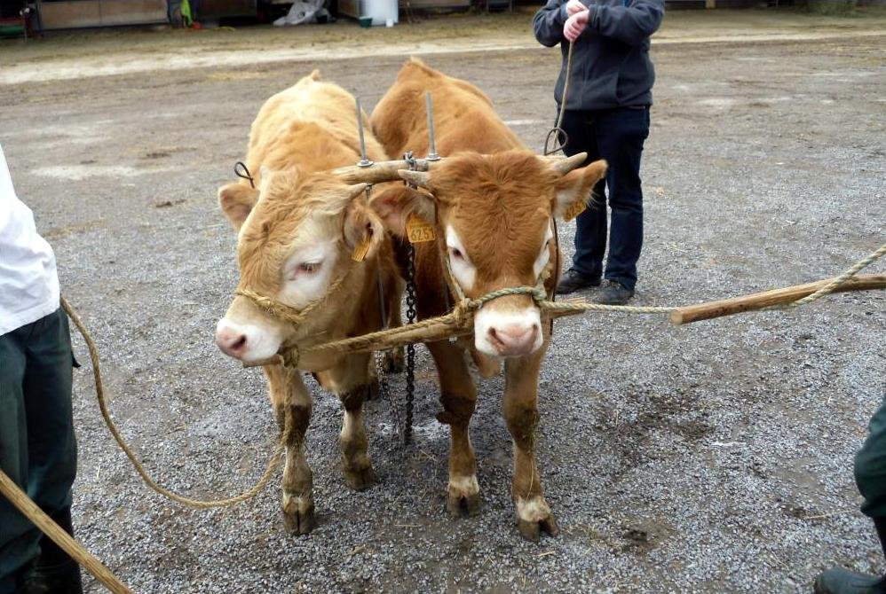 J’avais dans mon troupeau une vache « Baleine », très docile . J’ai cherché, toujours dans mon troupeau, une vache ayant la même morphologie , « Bikini ». Elle était plus rude avec un caractère bien trempé mais pas méchante et sans vice . J’ai commencé à leur faire accepter le joug attaché au cornadis, et c’est madame Valérie WEIDER, âgée de 85 ans , qui m’a montré comment lier (ici on dit june, joindre en français).
